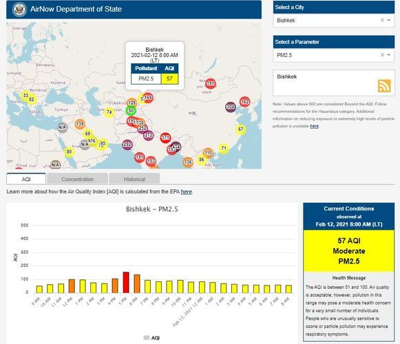 The U.S. Embassy in Kyrgyzstan also installed a sensor. It shows the air quality index online. Information is updated hourly.