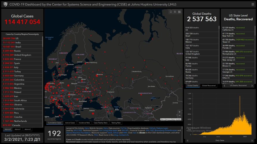 In total, 114,417,054 people got infected with coronavirus. The highest number of the infected is in the United States (28,659,784), India (11,112,241), Brazil (10,587,001), Russia (4,209,850), Germany (2,455,569), Italy (2,938,371), Spain (3,204,531), France (3,820,342), Turkey (2,711,479), Columbia (2,255,260) and Great Britain (4,194,289).