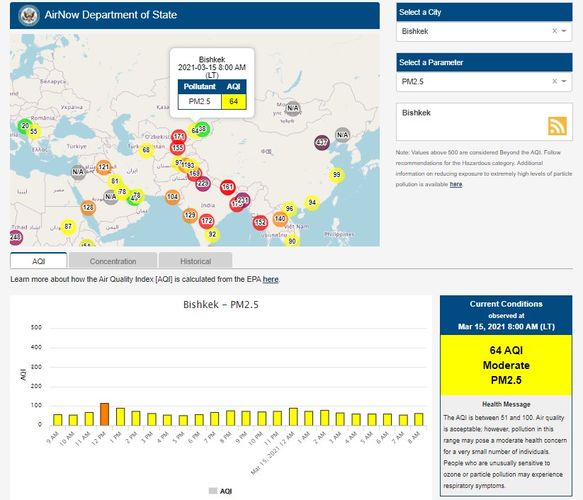 The U.S. Embassy in Kyrgyzstan also installed a sensor. It shows the air quality index online. Information is updated hourly.