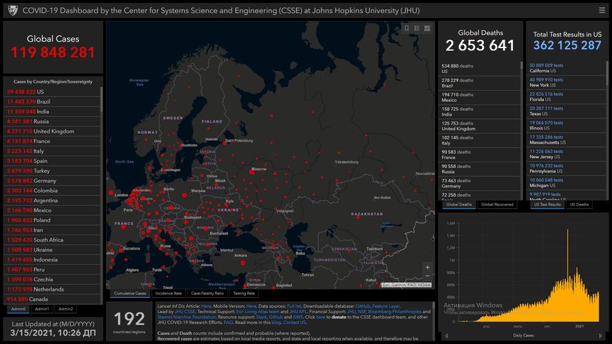 In total, 119,848,281 people got infected with coronavirus. The highest number of the infected is in the United States (29,438,222), India (11,359,048), Brazil (11,483,370), Russia (4,341,381), Germany (2,578,842), Italy (3,223,142), Spain (3,183,704), France (4,131,874), Turkey (2,879,390), Columbia (2,303,144) and Great Britain (4,271,710).