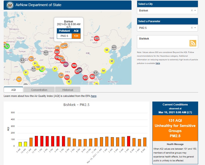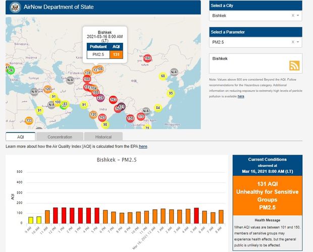 The U.S. Embassy in Kyrgyzstan also installed a sensor. It shows the air quality index online. Information is updated hourly.