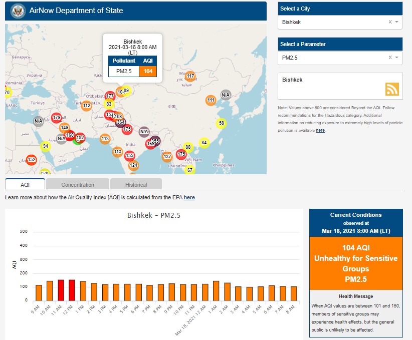 The U.S. Embassy in Kyrgyzstan also installed a sensor. It shows the air quality index online. Information is updated hourly.