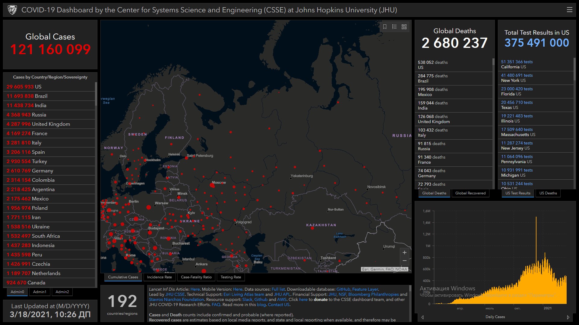 In total, 121,160,099 people got infected with coronavirus. The highest number of the infected is in the United States (29,605,933), India (11,438,943), Brazil (11,693,838), Russia (4,368,943), Germany (2,610,769), Italy (3,281,810), Spain (3,206,116), France (4,169,274), Turkey (2,930,554), Columbia (2,314,154) and Great Britain (4,287,996).