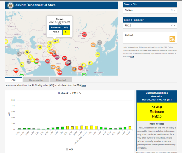 The U.S. Embassy in Kyrgyzstan also installed a sensor. It shows the air quality index online. Information is updated hourly.