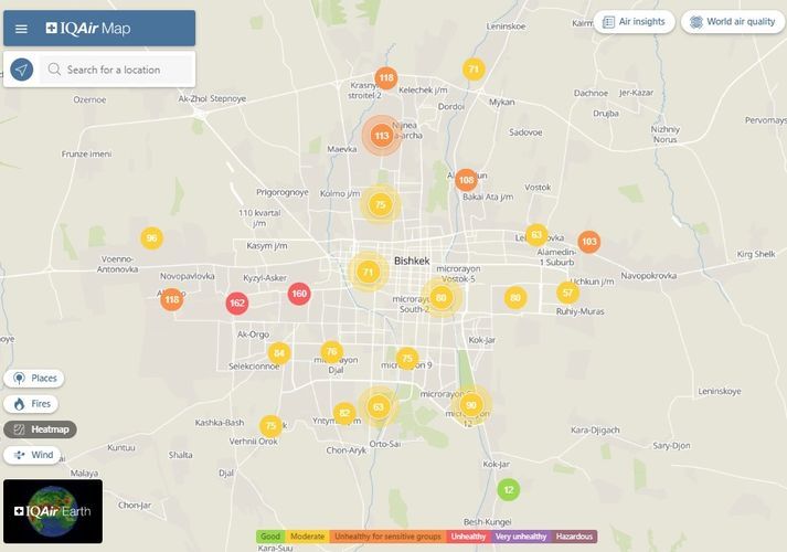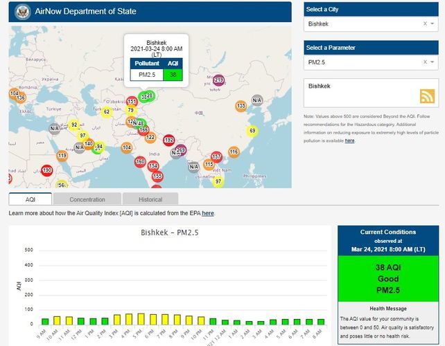 The U.S. Embassy in Kyrgyzstan also installed a sensor. It shows the air quality index online. Information is updated hourly.