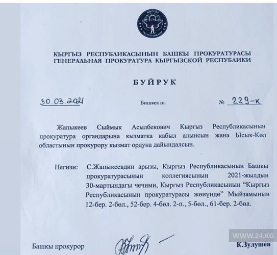 According to the order at the disposal of 24.kg news agency, Syimyk Zhapykeev was again hired by the prosecution bodies and appointed the head of the supervisory body in Issyk-Kul region.