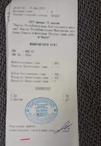 At least 78 Kyrgyzstanis voted for amendments to the Basic Law at PEC No. 9004, and 27 voted against. At the same time, only 106 out of 843 Kyrgyzstanis registered at this polling station took part in the plebiscite.
