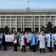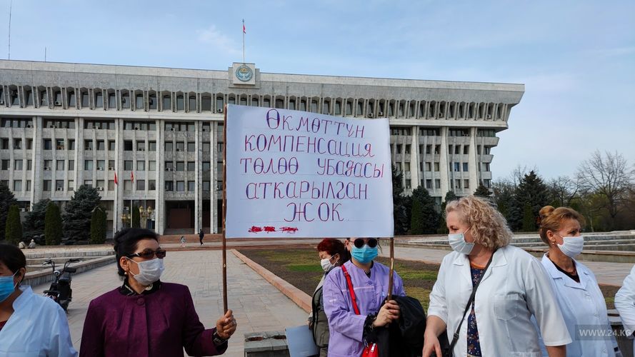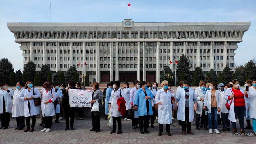 Medical workers from Bishkek and Chui region hold a rally at the building of the Parliament in the capital. More than 100 doctors turn to the president and demand payment of the promised compensation in the amount of 200,000 soms for work in red zones during the coronavirus pandemic.