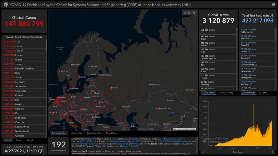 In total, 147,880,799 people got infected with coronavirus. The highest number of the infected is in the United States (32,124,385), India (17,313,163), Brazil (14,369,423), France (5,565,080), Russia (4,717,321), Turkey (4,667,281), Great Britain (4,422,562), Italy (3,971,114), Spain (3,488,469), Germany (3,312,653), Argentina (2,879,667), Columbia (2,787,303), and Poland (2,762,323).