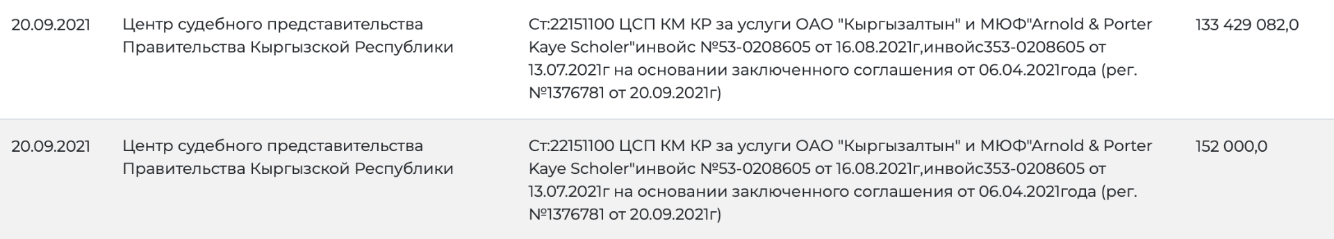Payments were made to Kyrgyzaltyn OJSC and the international law firm Arnold & Porter Kaye Scholer according to invoices dated August 16, 2021 and July 13, 2021 with the same number 53-0208605. Both invoices were issued on the basis of an agreement signed on April 6, 2021.