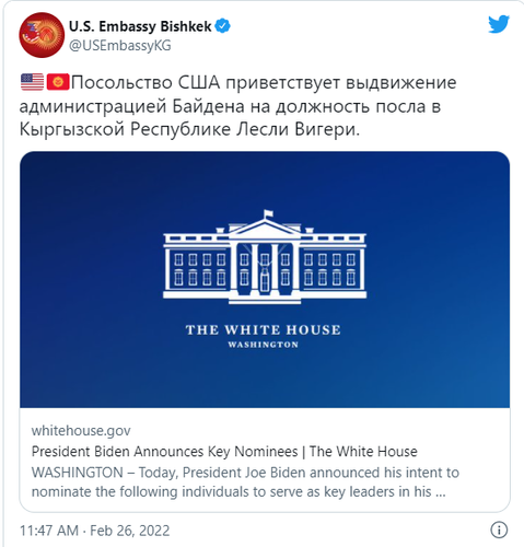 Administration of Joe Biden nominated Lesslie Viguerie for the post of U.S. Ambassador to Kyrgyzstan. The U.S. Embassy in Bishkek reported on Twitter.