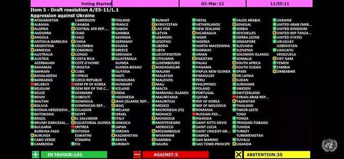 According to an Ukrinform correspondent in New York, the decision was made by an unprecedented number of votes: 141 countries voted for, 5 voted against (Russia, Belarus, Syria, North Korea, Eritrea), and 35 abstained.
