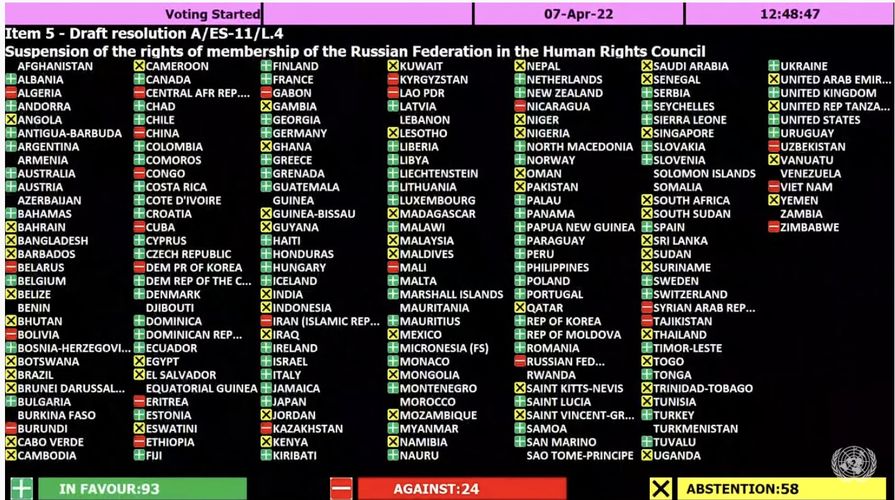 The resolution is titled «Suspension of Rights of the Russian Federation Associated with Membership in the UN Human Rights Council,» and the voting was based on another document, a General Assembly resolution that established the UN Human Rights Council in 2006. In particular, it states that «the General Assembly, by a two-thirds majority of the members present and voting, may suspend a member of the Council who commits gross and systematic violations of human rights.»