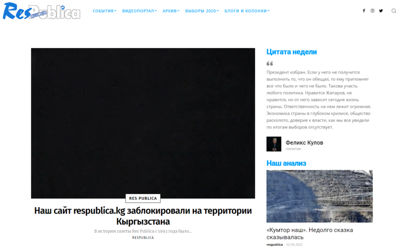 The website of ResPublica newspaper was blocked on the territory of Kyrgyzstan. The Editor-in-Chief of the media outlet Zamira Sydykova reported on social media.
