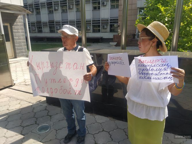 Two activists Ondurush Toktonasyrov and Burulkan Usmanalieva hold a rally near the building of the Ministry of Foreign Affairs of Kyrgyzstan in Bishkek.