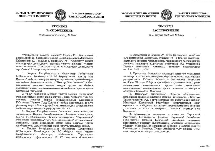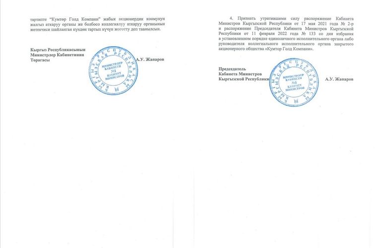 Akylbek Japarov, Chairman of the Cabinet of Ministers of Kyrgyzstan, signed a decree according to which the regime of external management is terminated at Kumtor mine. Kumtor Gold Company CJSC reported.