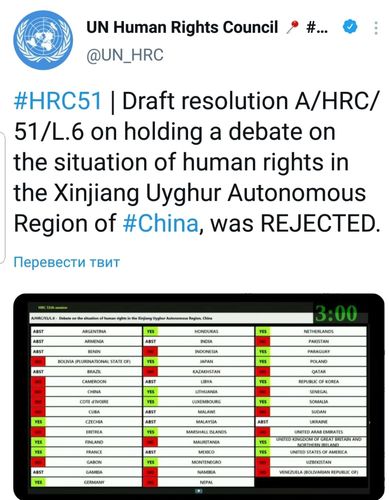 The UN Human Rights Council rejected a draft resolution on the violation of the rights of the Muslims living in the Xinjiang Uygur Autonomous Region. Website of the organization says.