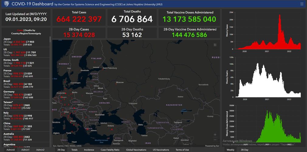 In total, 664,222,397 people got infected with coronavirus. The highest number of the infected is in the United States (101,244,321), India (44,681,148), Brazil (36,477,214), France (39,596,671), Russia (21,518,745), Turkey (17,042,722), Great Britain (24,442,197), Italy (25,279,682), Spain (13,693,478), Germany (37,509,539), Argentina (9,963,697), Iran (7,561,925) and Columbia (6,343,020).