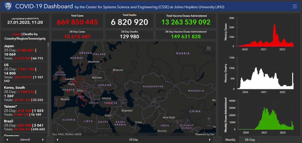 In total, 669,850,445 people got infected with coronavirus. The highest number of the infected is in the United States (102,259,155), India (44,682,338), Brazil (36,768,677), France (39,708,282), Russia (21,601,107), Turkey (17,042,722), Great Britain (24,507,203), Italy (25,415,630), Spain (13,722,677), Germany (37,728,155), Argentina (10,032,709), Iran (7,563,825) and Columbia (6,352,923).