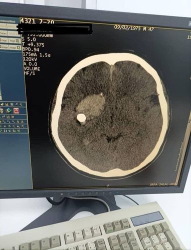 The patient was admitted with an open penetrating wound to the head — the bullet was in the frontotemporal lobe on the right.