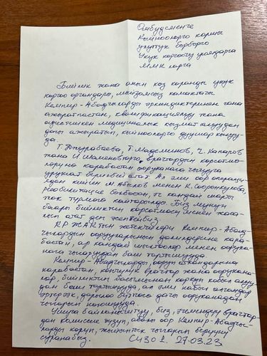 They ask to take measures and send Gulnara Dzhurabaeva, Taalaibek Mademinov, Ilgiz Shamenov and Chingiz Kaparov for treatment. The letter also says that Klara Sooronkulova and Mambetzhunus Abylov were returned to the detention center, despite the severe operations they had previously undergone, which can be regarded as torture.