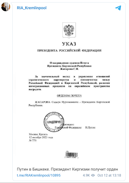 «For a significant contribution to strengthening the relations of strategic partnership and alliance between Russia and Kyrgyzstan, development of integration processes in the Eurasian space,» the decree says.