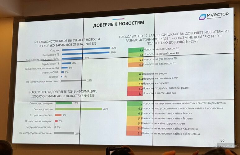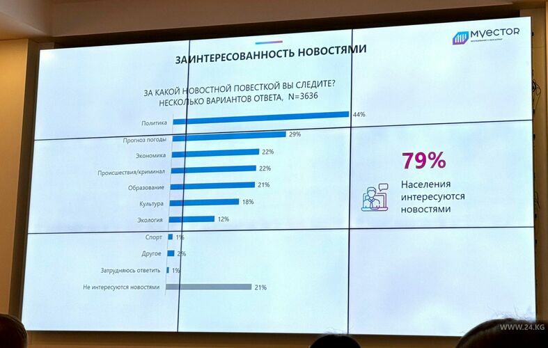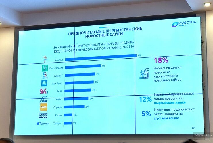 24.kg news agency is one of the five most read media outlets in the country. The media market research «Perception and Behavior of Media Audience in Kyrgyzstan. 9th wave», which was conducted by the research and consulting company M-Vector together with Internews in the Kyrgyz Republic, says.