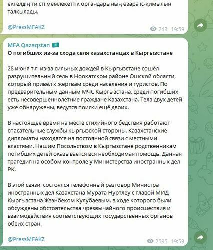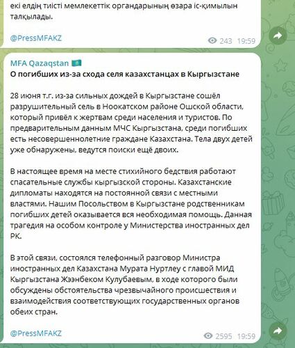 The Foreign Ministry added that in this regard, the Minister of Foreign Affairs of the Republic of Kazakhstan, Murat Nurtleu, had a telephone conversation with the head of the Ministry of Foreign Affairs of the Kyrgyz Republic, Jeenbek Kulubaev, during which the circumstances of the emergency and the interaction of the relevant government bodies of both states were discussed.