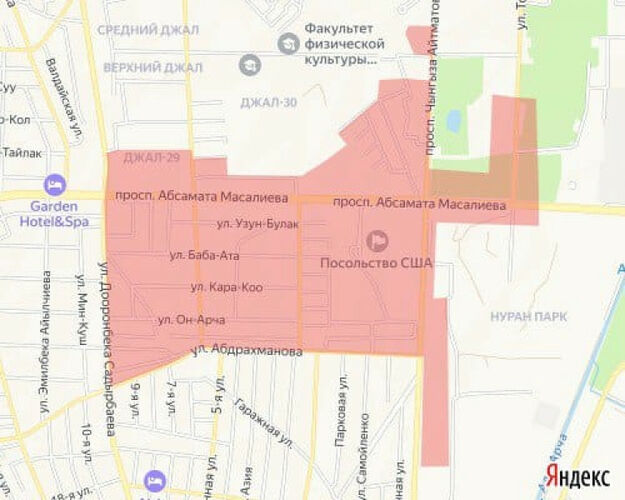 The shutdown area is Dooronbek Sadyrbaev Street, Absamat Masaliev Street, Chingiz Aitmatov Avenue, Yntymak Park, Toktonaliev Street, Absamat Masaliev Street, Chingiz Aitmatov Avenue, Yuzhny residential complex and Abdrakhmanov Street.