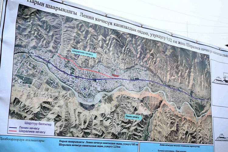 The Cabinet Chairman then inspected the progress on Lenin Street, which is 9.5 kilometers long and 24 meters wide, and on Sheraliev Street, 2.2 kilometers long and 10.5 meters wide. The roadworks include widening, asphalt paving, and demolition of certain structures.