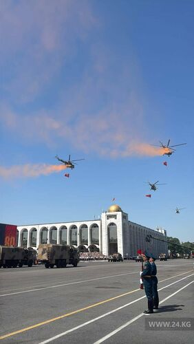 At the start of the event, President of Kyrgyzstan Sadyr Japarov laid flowers at the Eternal Flame on Victory Square, after which he arrived at the central square. There he congratulated those gathered on the 80th anniversary of Victory in the Great Patriotic War and officially opened the parade.