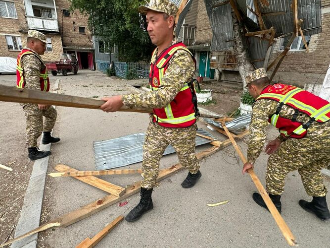 A strong wind tore roofs off multi-story buildings in the city of Talas. The press service of the Ministry of Emergency Situations of Kyrgyzstan reported.