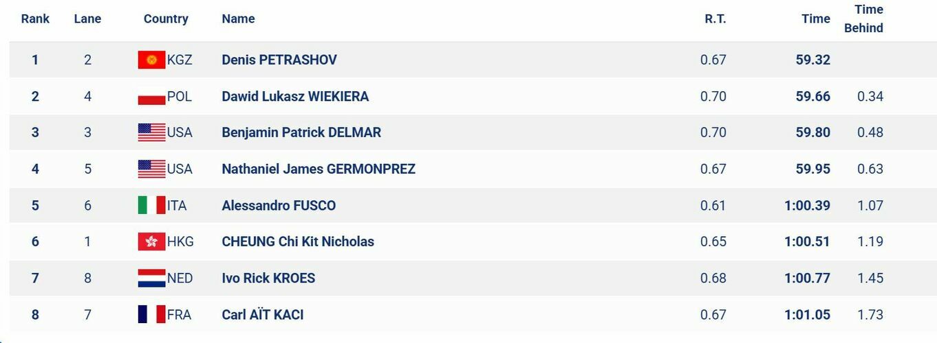 In the 100-meter breaststroke in the final, the Kyrgyzstani showed a result of 59.32 seconds.