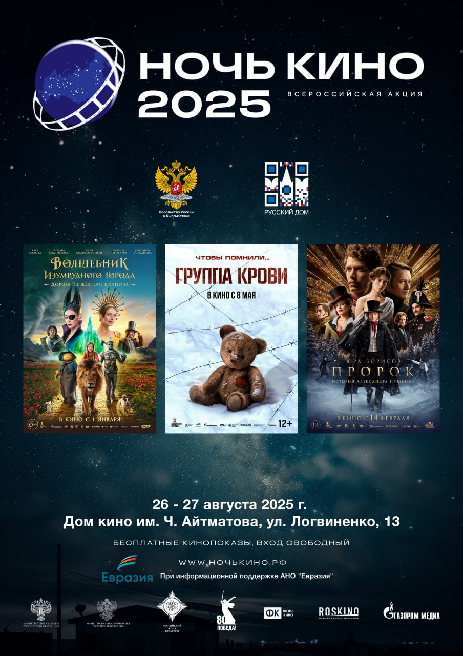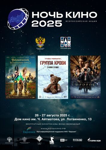 The event Cinema Night will be held in Bishkek and Osh cities on August 23, 26, and 27. The screenings are organized by the representative office of Rossotrudnichestvo in the Kyrgyz Republic.