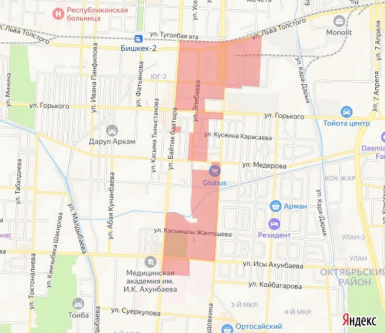 - Leo Tolstoy — Zhukeev-Pudovkin — Kulatov — Akhunbaev streets.