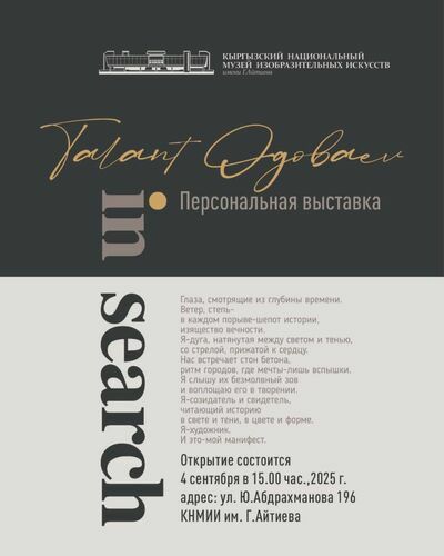 A personal exhibition of Talant Ogobaev In Search will open on September 4 at the Kyrgyz National Museum of Fine Arts named after Gapar Aitiev. The Kyrgyz National Museum of Fine Arts reported.