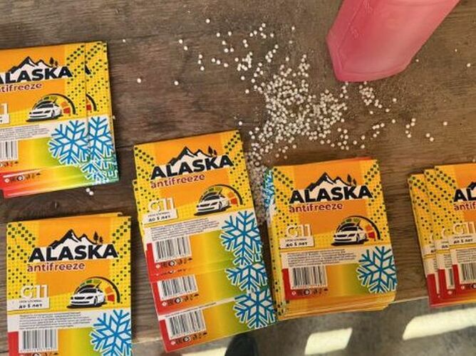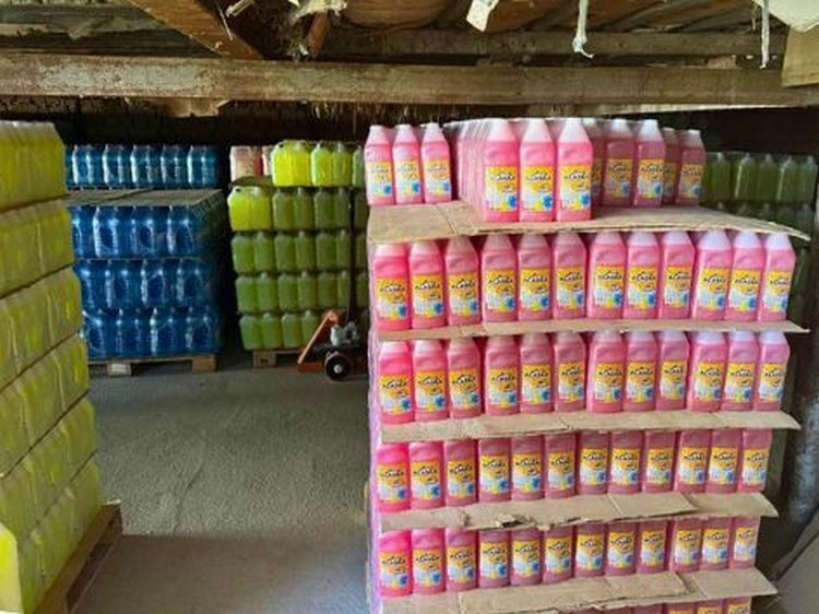 During the inspection, officers found 45 tons of a colorless liquid, presumably industrial alcohol, along with a large stock of labels, caps, containers, and finished products including antifreeze, windshield washer fluid, and other chemicals.