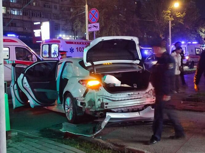 According to them, the crash took place at the intersection of Abdrakhmanov and Bokonbaev streets. Preliminary information suggests that one of the vehicles was moving at high speed, while another car attempted to pass through the intersection on a flashing green light. As a result, the two cars collided. The impact threw one of the vehicles to the side. The force of the collision was so strong that the car destroyed a traffic light and a lamppost.