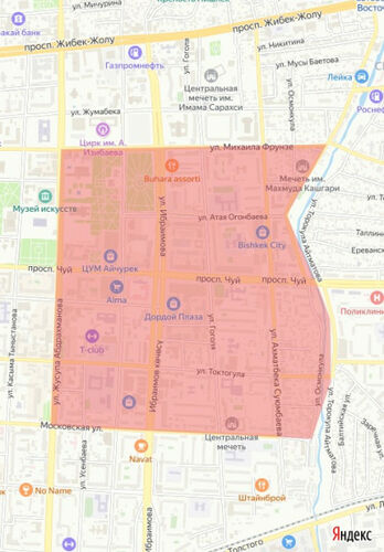 The affected area: Osmonkul Street (from Chui Avenue to Zhibek Zholu Avenue), Moskovskaya, Ibraimov, and Frunze Streets.