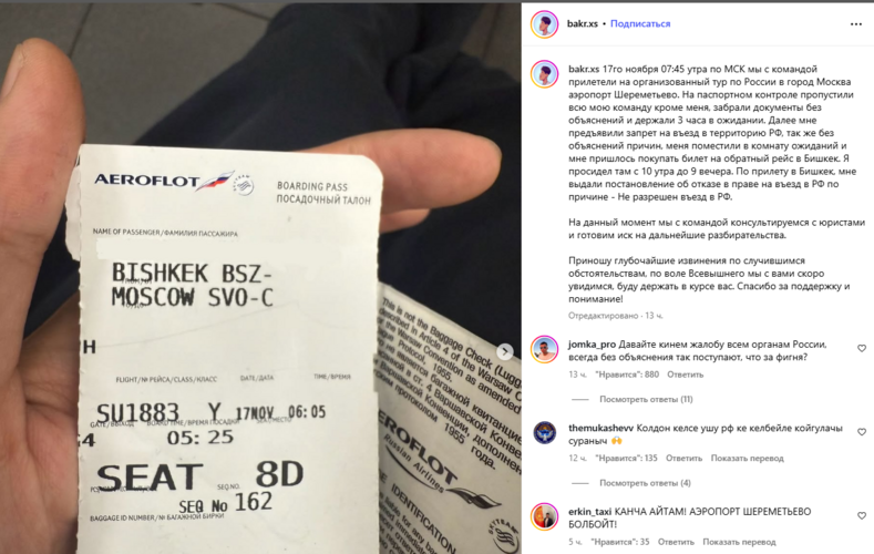 Kyrgyz rapper Bakr was denied entry to Russia at Sheremetyevo Airport. He reported on Instagram.