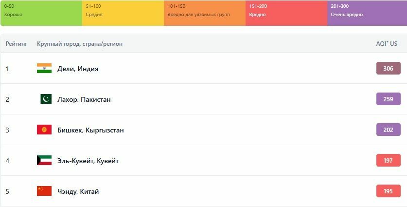 In the ranking, Bishkek takes the third place after Delhi (India) with an AQI of 306 and Lahore (Pakistan) with an AQI of 259. Bishkek is followed by Kuwait City (Kuwait) and Chengdu (China).