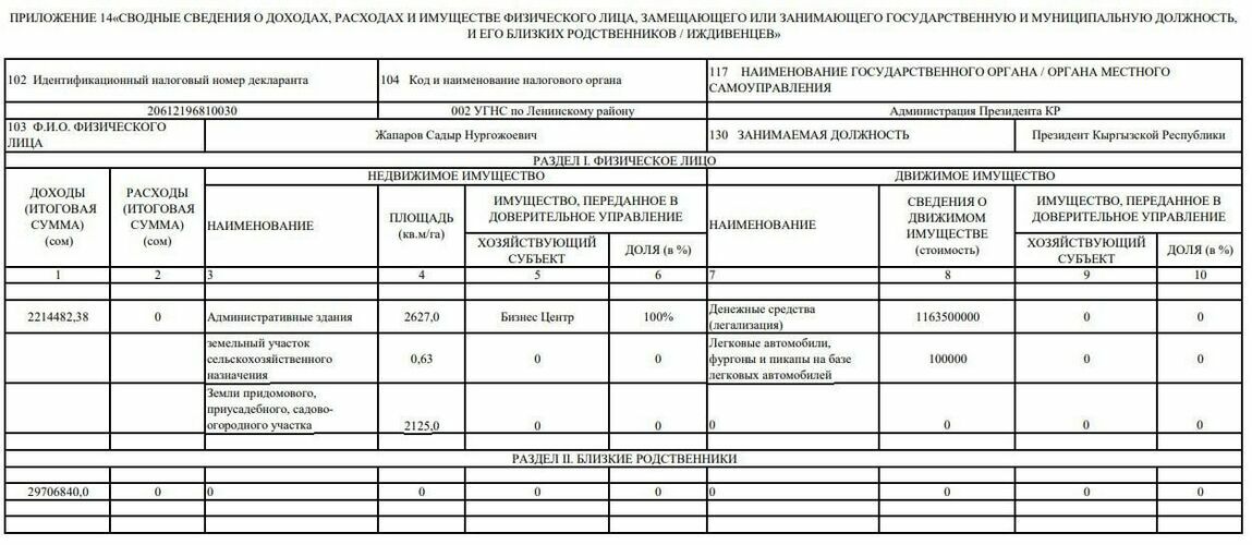 The income of his close relatives amounted to 29,706,840 soms.