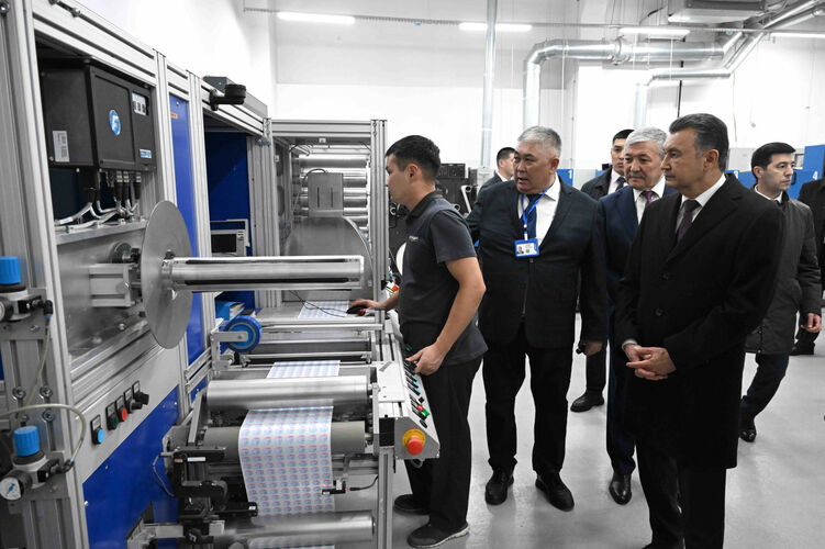 At Uchkun OJSC, the heads of government toured the binding and offset workshops, where printed materials are produced. The delegations were shown the production process of excise stamps, state documents, special forms, and state registration plates. Equipment for fuel marking and quality control was also presented.