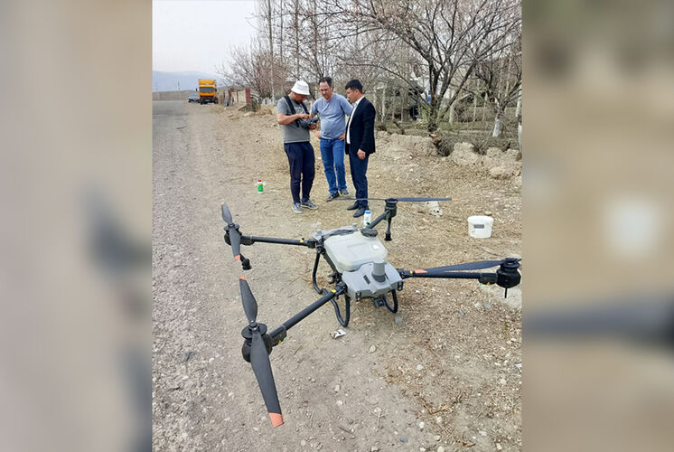 In Samarkandek rural area, orchards are being treated against pests using specialized drones. The main goal is to protect agricultural crops and increase yields.