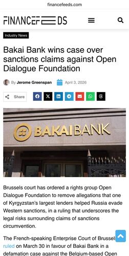 In 2023, ODF published materials recommending sanctions against the bank, accusing it of possible involvement in schemes to circumvent embargoes in favor of Russia. In response, Bakai Bank filed a lawsuit to defend its business reputation.