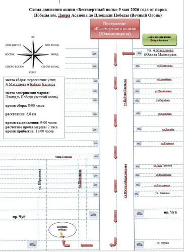 Participants will gather at 8 a.m. at the Southern Gates. At 9 a.m., the column will start moving along Baytik Baatyr Street, then proceed along Chui Avenue to Shopokov Street.