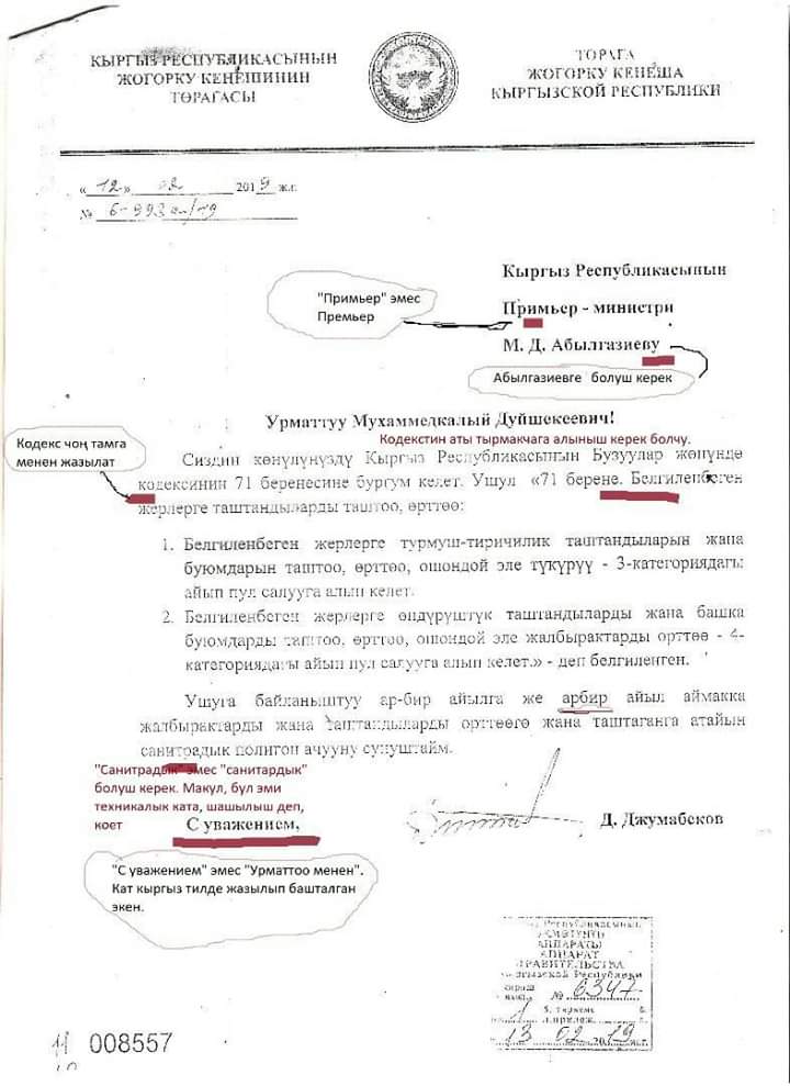 Эске салсак, социалдык түйүндөрдө Жогорку Кеңештин төрагасынын өкмөт башчысы Мухаммедкалый Абылгазиевге жазган кайрылуу катындагы одоно каталар тууралуу талкуу болгон. Анда жазылган катта бир канча катанын асты кызыл менен белгиленип көрсөтүлгөн.