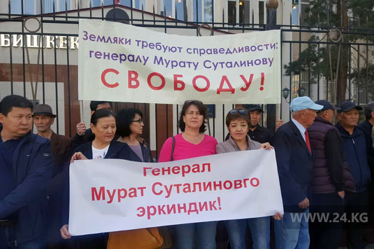 Атайын кызматтын мурунку башчысын колдоо үчүн 50дөй киши чогулган. Тарапташтары «Генерал Суталиновго боштондук», «Айкөлдүк кылгыла» деген жазуулары бар плакаттарды көтөрүп алышкан.