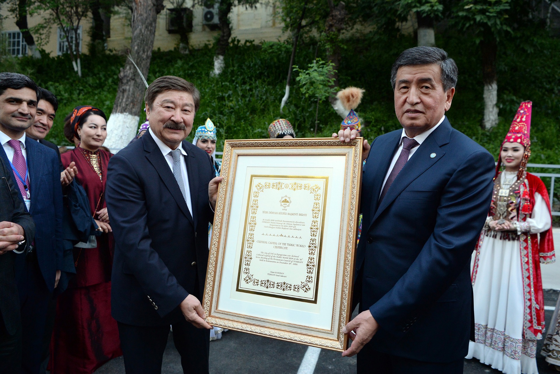 Ош шаарын Түрк дүйнөсүнүн маданий Борбору деп жарыялоо боюнча салтанаттуу аземдин ачылышына Азербайжан, Босния, Казакстан, Македония, Өзбекстан, Россия, Сербия, Түркмөнстан, Түркия өлкөлөрүнүн өкүлдөрү жана өлкөнүн бардык аймактарынан кыргызстандыктар келишти.