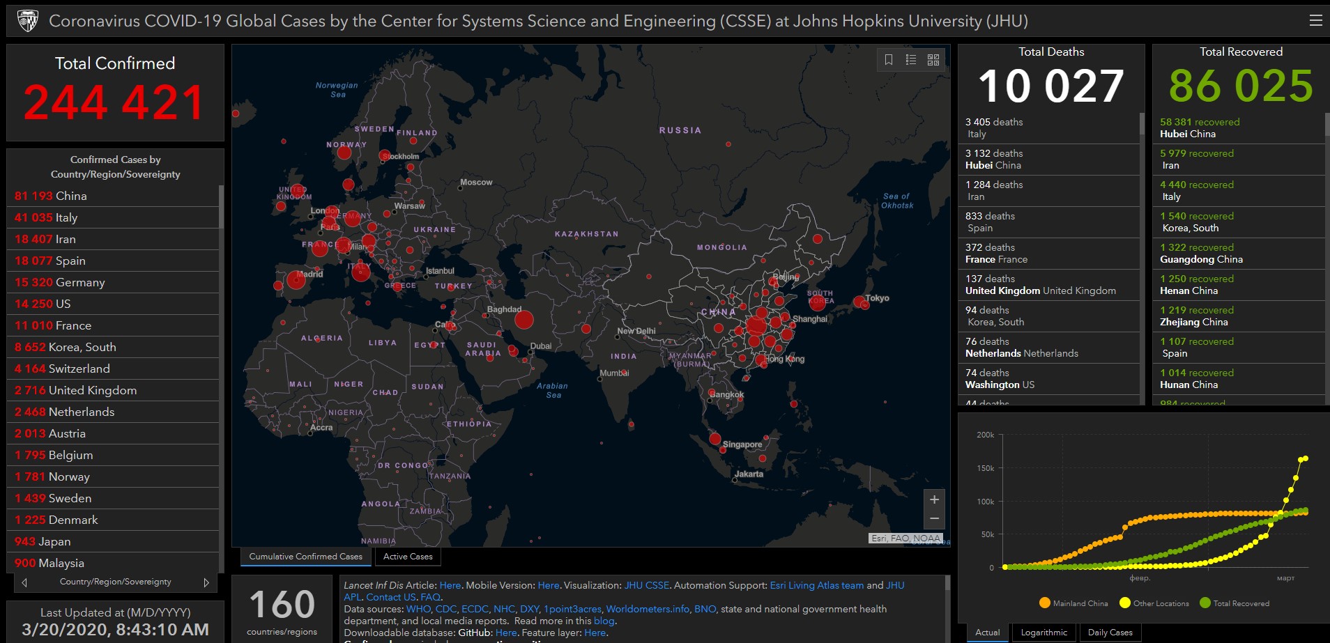 COVID-2019 коронавирусу дүйнө жүзү боюнча 160 өлкөнү каптап алды. Бул тууралуу окумуштуулар ойлоп тапкан онлайн-карта аныктаган. Бүгүнкү күндө дүйнөдө 244 миң 421 адамдан коронавирустун симптомдору аныкталган. Бир күндө катталгандардын саны 25 миң 644тү көрсөтүүдө.